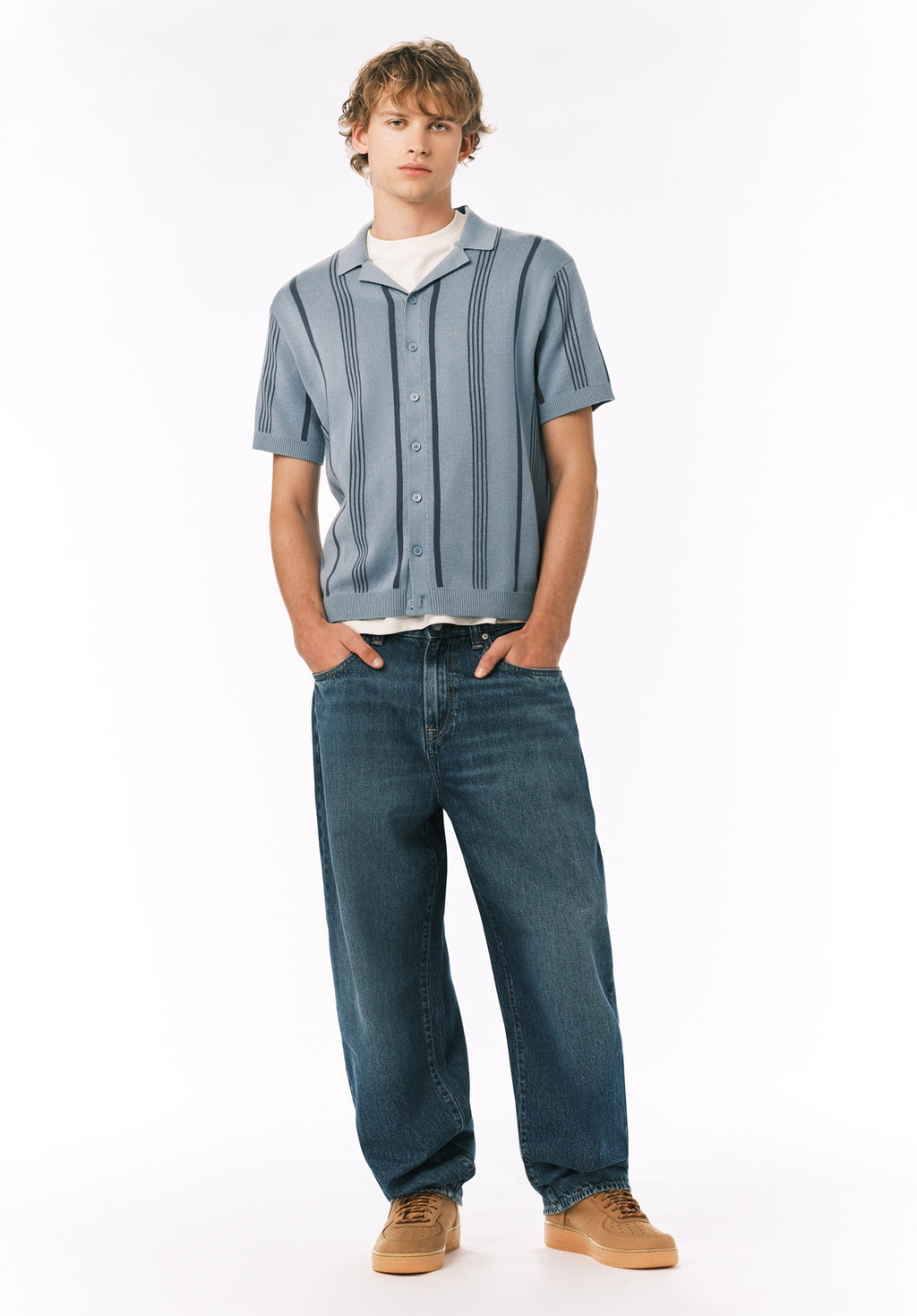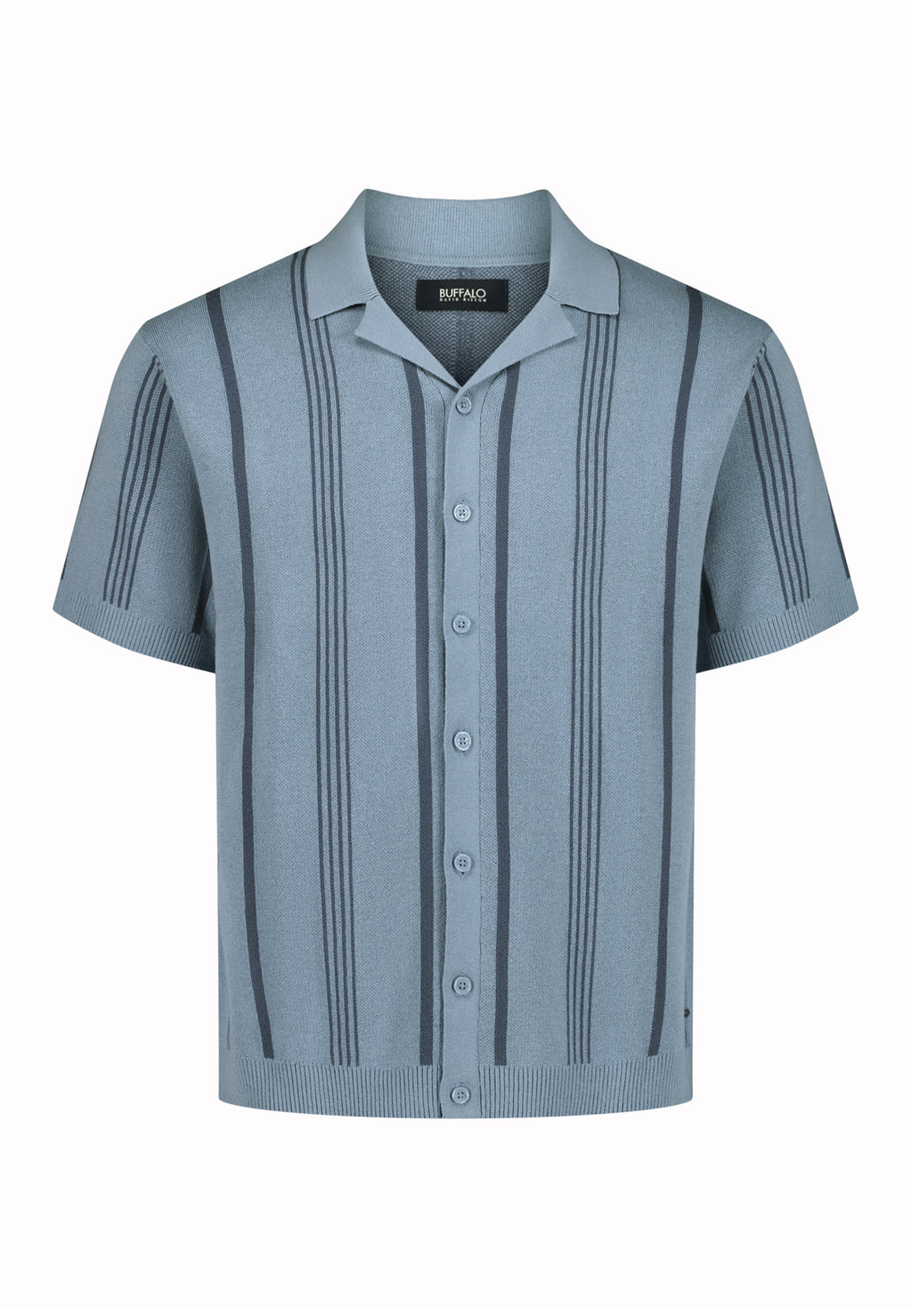 The Waldir men’s short sleeve knit button-up shirt features a clean vertical stripe pattern with a classic open collar and button-front closure. Finished with ribbed trim, it offers an easy, polished look that pairs well with denim or casual trousers.