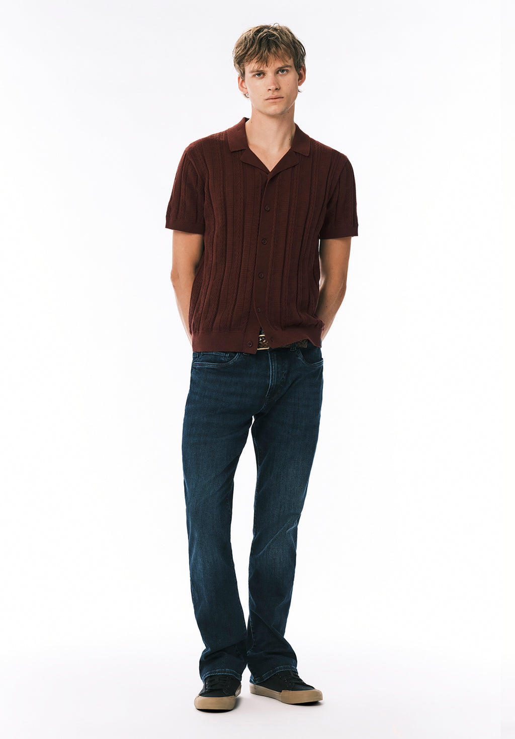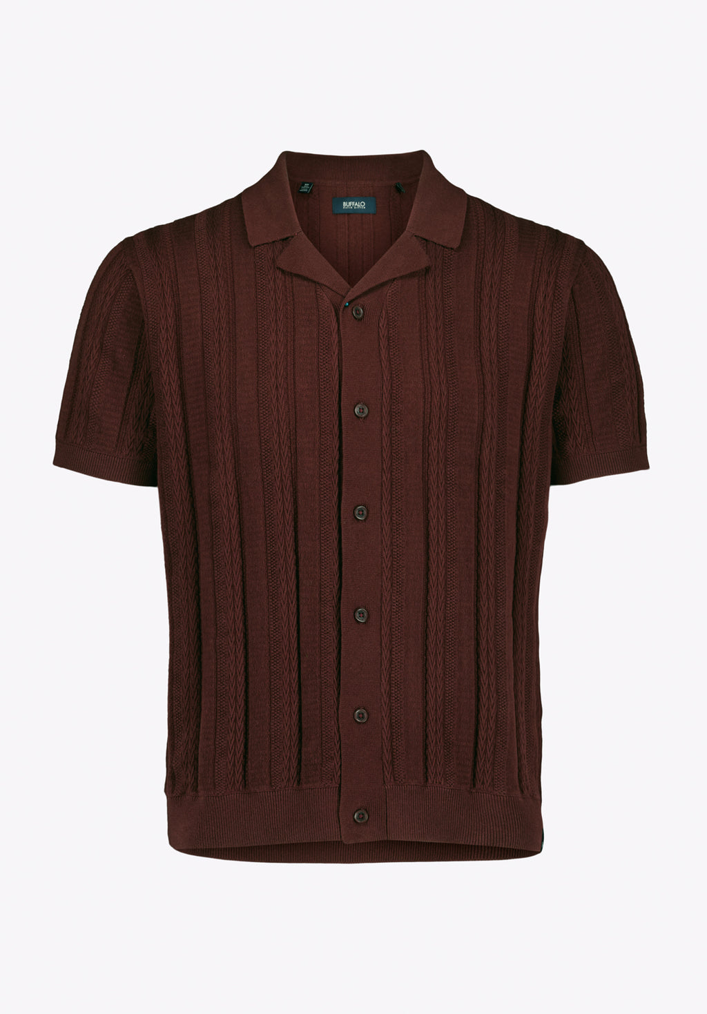 La chemise boutonnée Wasko pour homme à manches courtes en maille torsadée est conçue avec un motif côtelé vertical texturé, un col à revers et une fermeture boutonnée, réalisée dans un tricot léger pour un style décontracté et soigné.