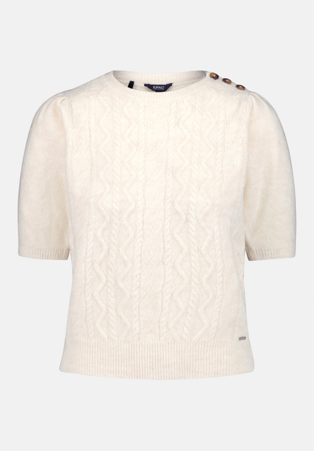 Pull à manches courtes en maille torsadée avec boutons décoratifs à l’épaule. Maille douce et texturée pour un style chic et confortable, à porter seul ou en superposition.