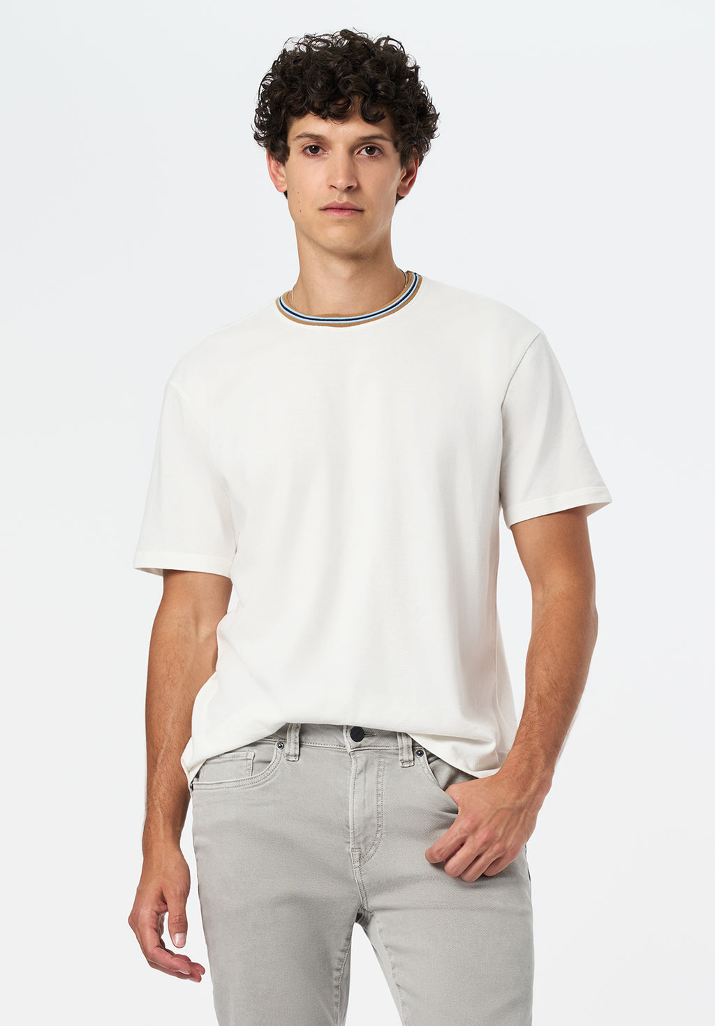 Haut Kobalt, essentiel simple et confortable en jersey de coton doux à coupe régulière. Col côtelé contrasté avec fines rayures multicolores, manches courtes classiques et ourlet droit pour une polyvalence au quotidien.