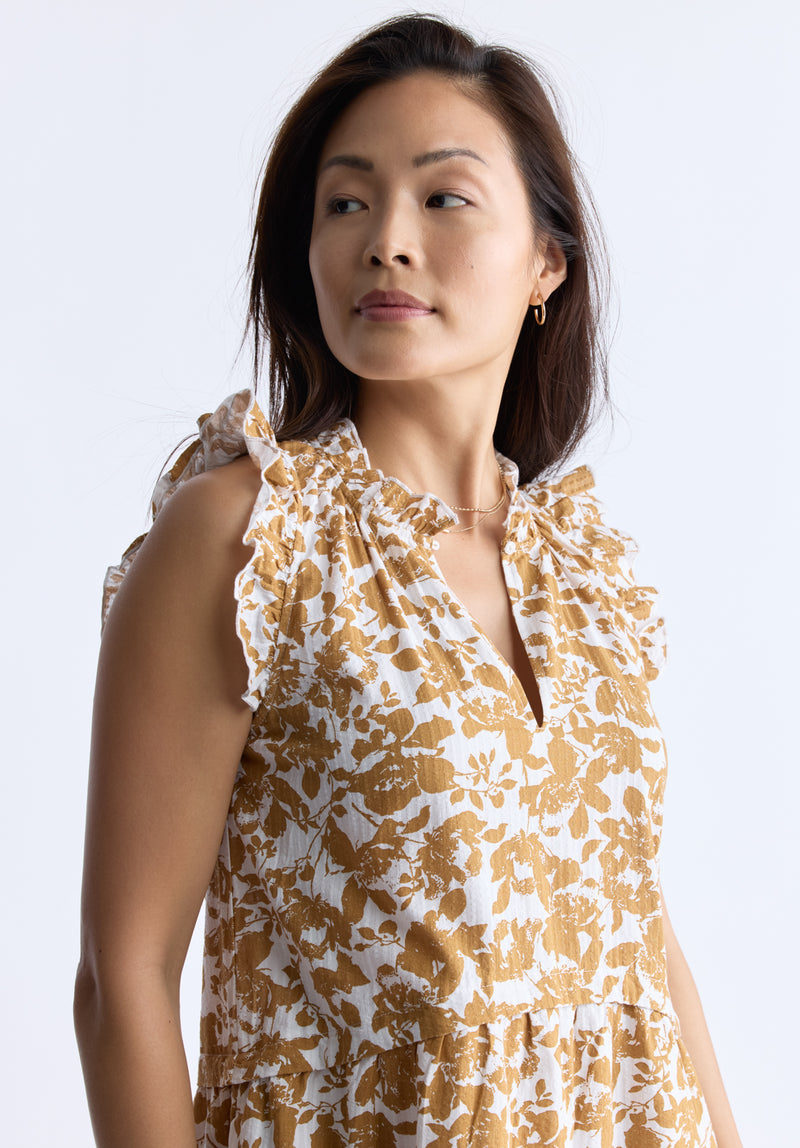 Vous voudrez certainement porter cette robe élégante tout au long de l’été! Agrémentée d’un charmant motif floral et de volants, c’est un choix idéal pour toutes vos soirées estivales.