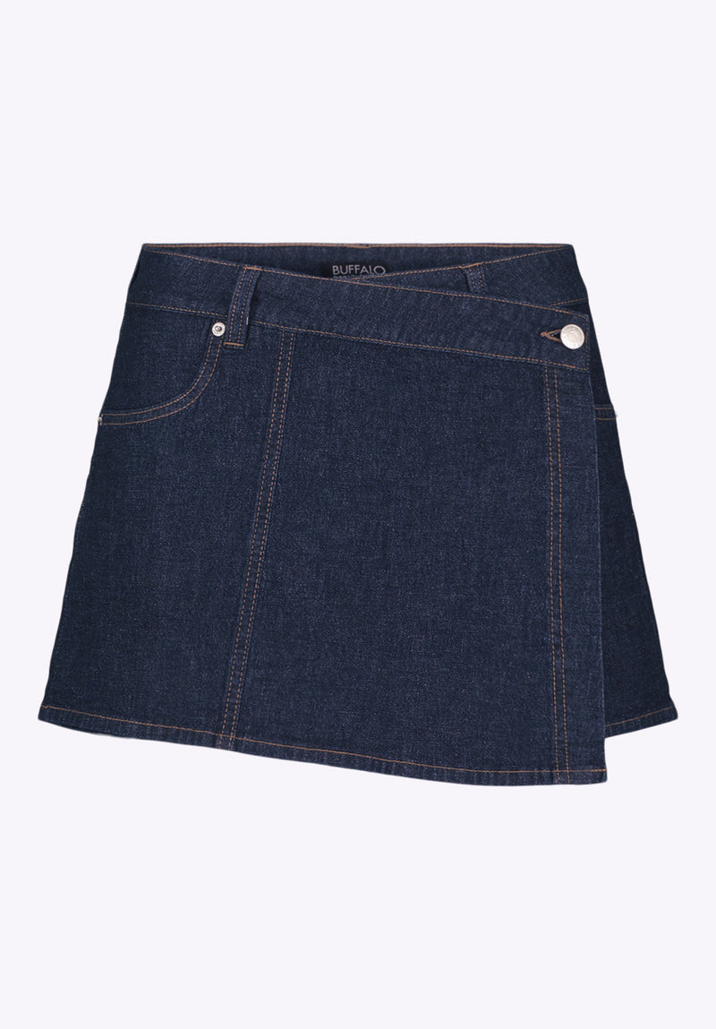 Stay effortlessly stylish with this dark wash denim skort Olivia that combines the look of a mini skirt with the comfort of shorts. Featuring a unique asymmetrical overlap design and a secure side button closure, this piece offers a modern twist on a classic silhouette. The skort is accented with contrast stitching and functional belt loops, making it perfect for versatile styling. Pair it with a cropped top or a fitted tee for a chic and casual outfit that’s ideal for any occasion.