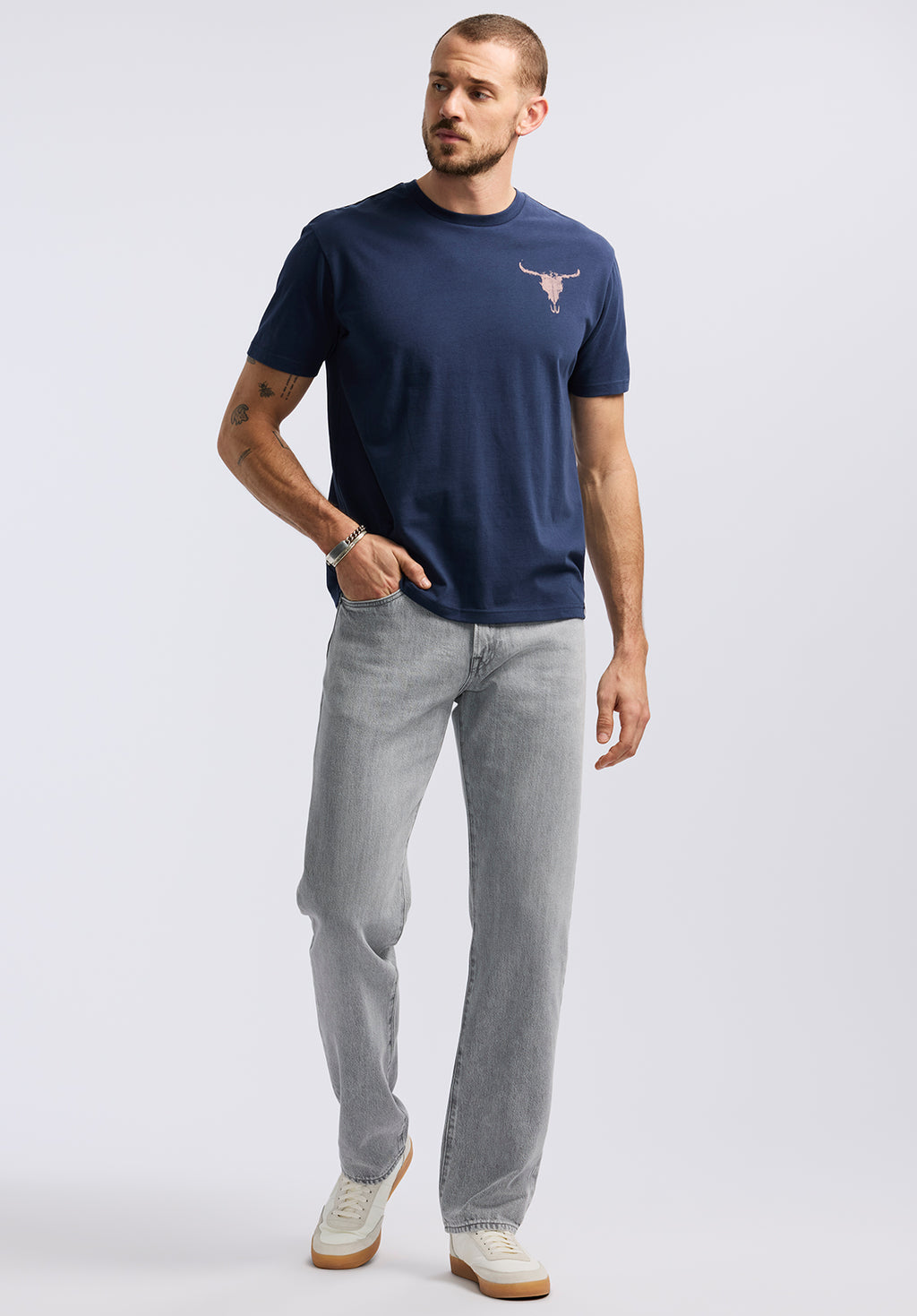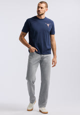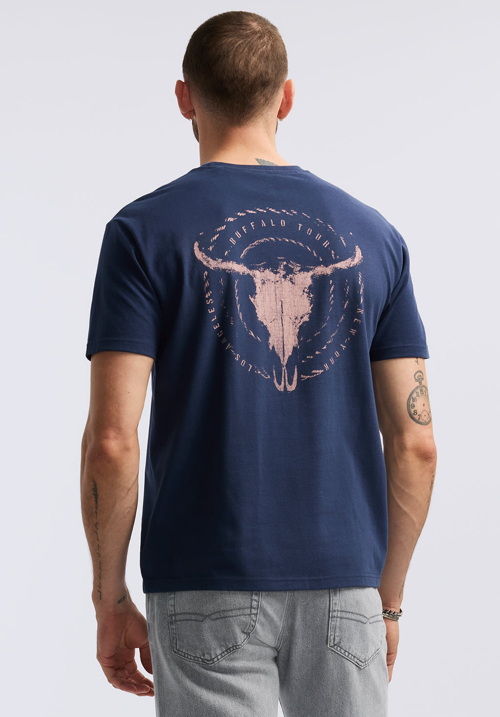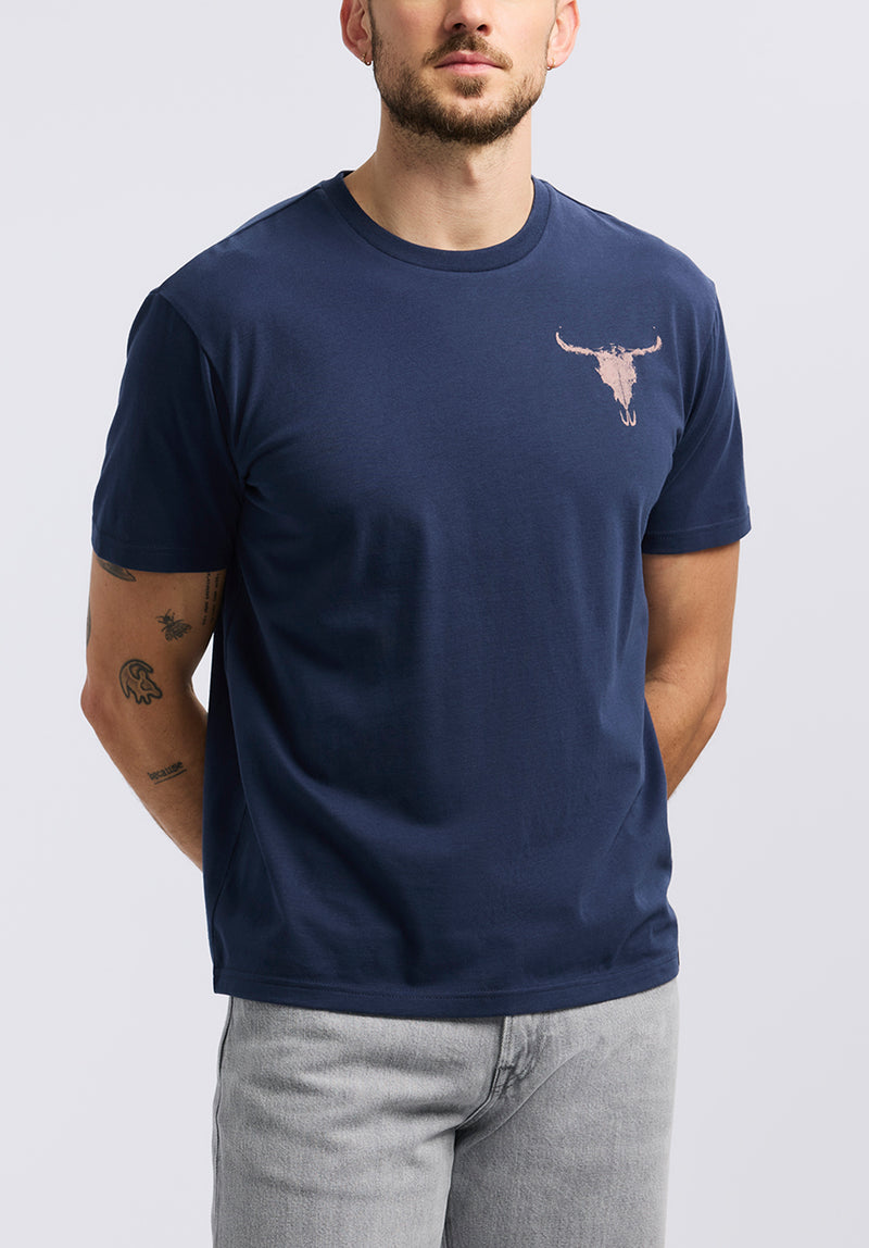 Bring bold, western-inspired energy to your casual wardrobe with the Tundla men's graphic t-shirt. Made from soft cotton, this crewneck tee features a distressed longhorn skull graphic on the chest and a large circular skull print on the back, surrounded by rugged rope detailing and “Buffalo Tour” text. The deep navy color makes it a standout piece for laid-back weekends or casual nights out. Pair it with denim and boots for a fearless, lived-in look.